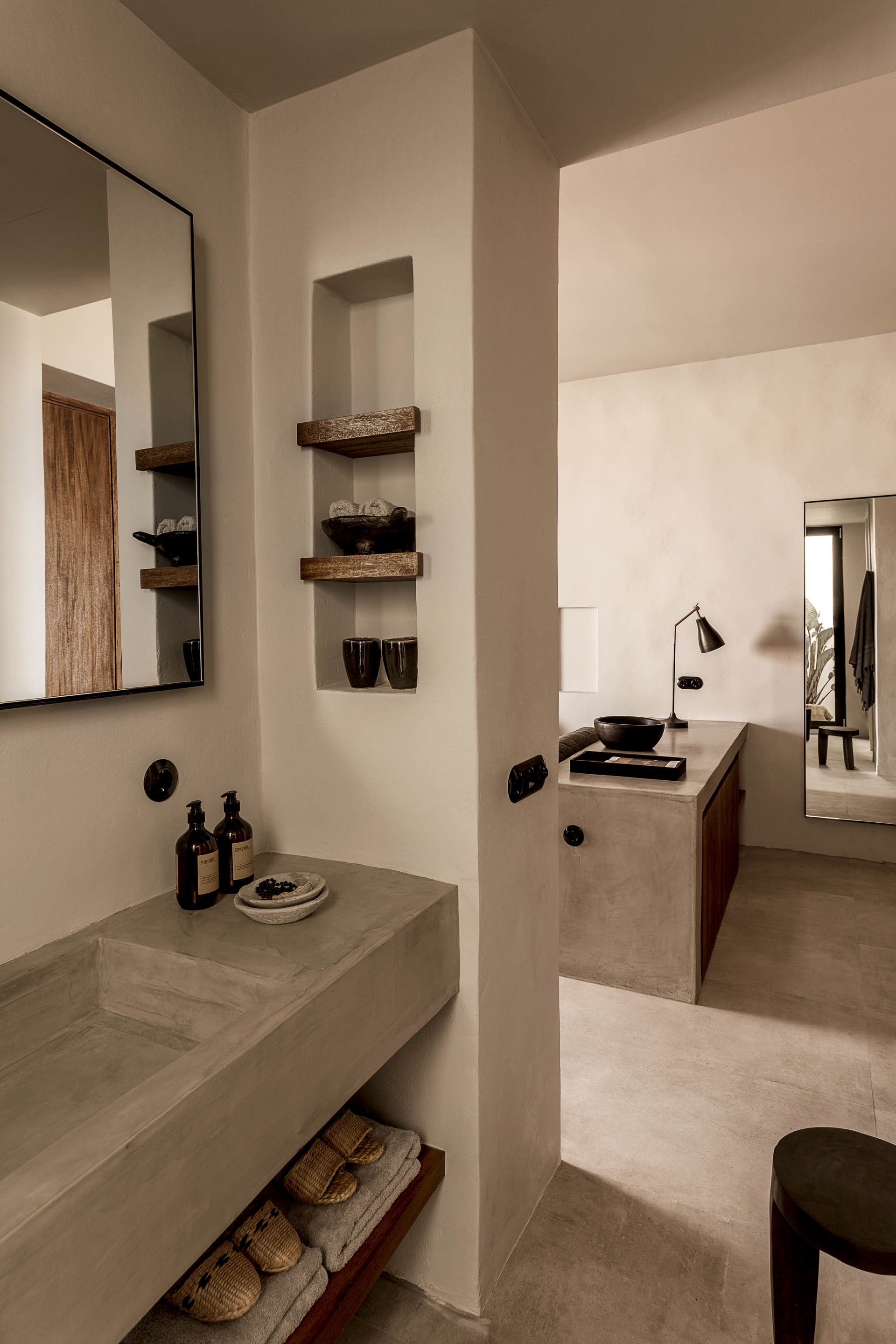 The cubic, one- and two-storey buildings are contemporary and minimalist, derived from a centuries-old Greek architectural style. Large terraces extending into private outdoor space. Indoor and outdoor restaurant, open kitchen, centred bar, with terraces on the poolside or overlooking the beach and sunset.