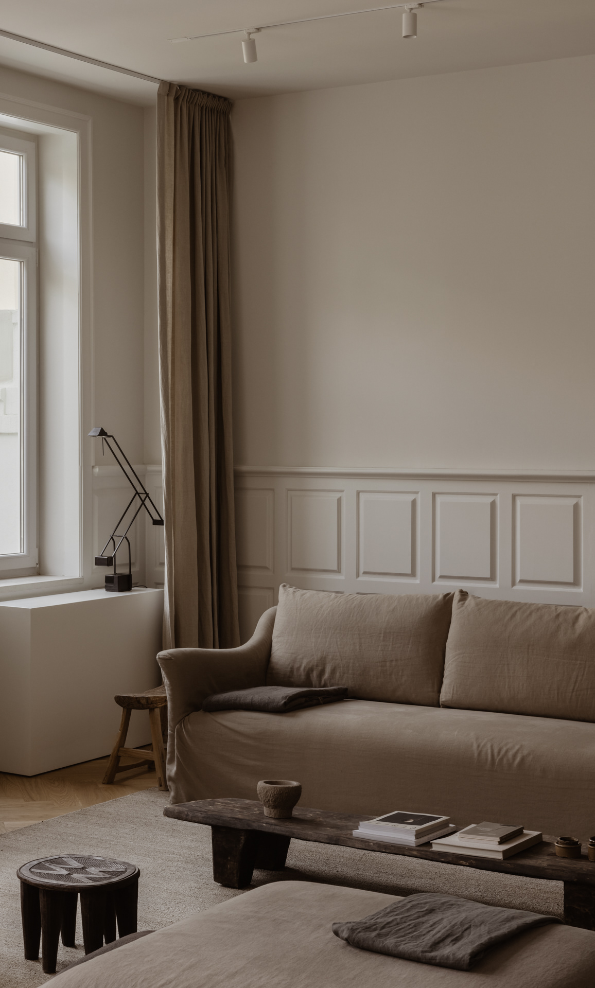 The space merges vintage classics with modern elements, using natural materials, warm tones, and rich textures to create a refined, harmonious atmosphere. The apartment has become a home for Annabell and her husband—a place to anchor their life between Berlin and Lisbon, driven by the dream of living near the sea and sun.